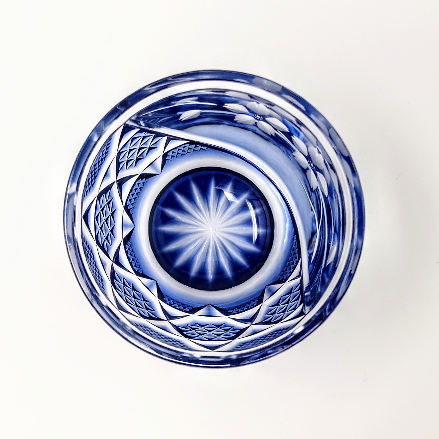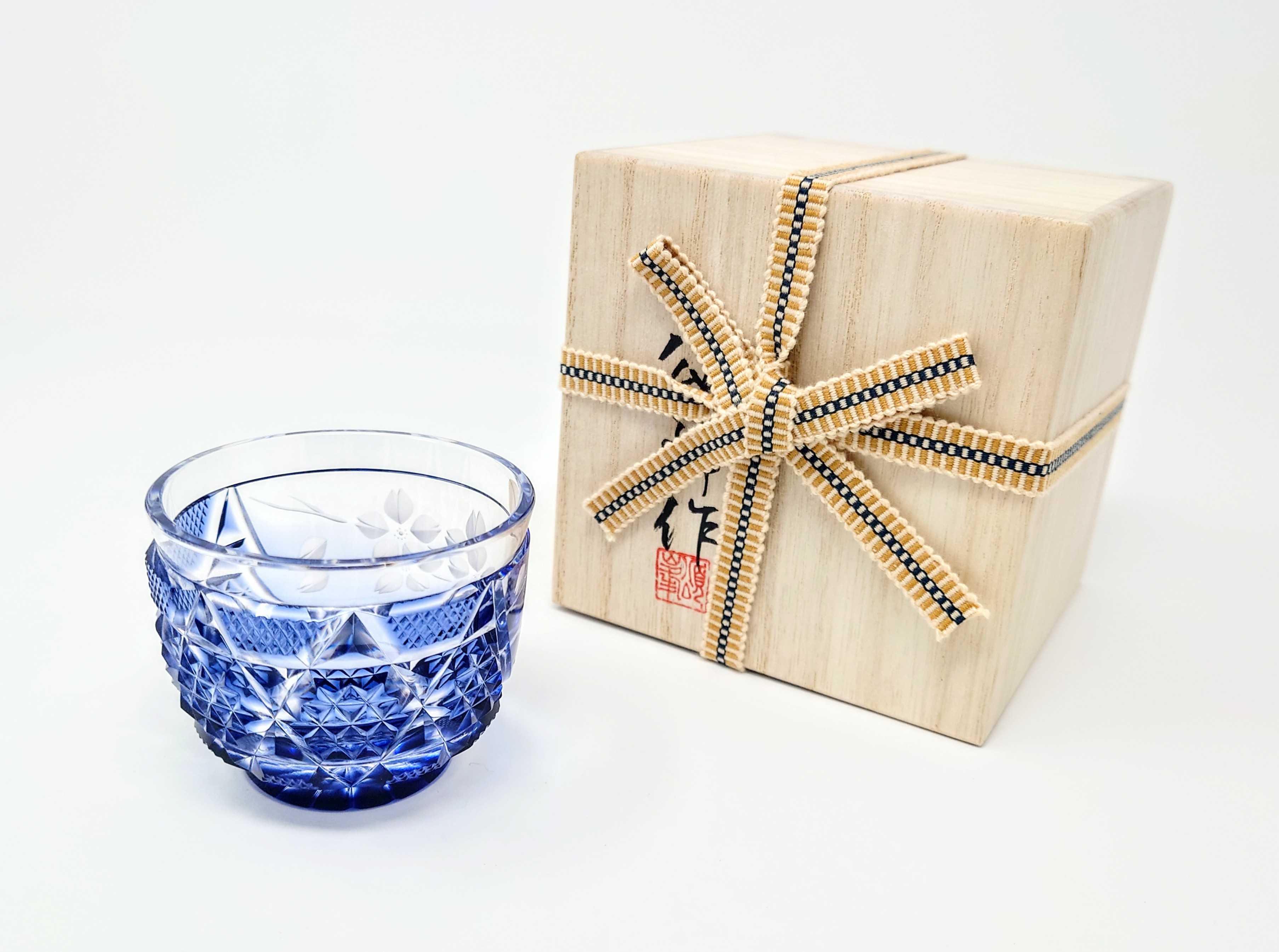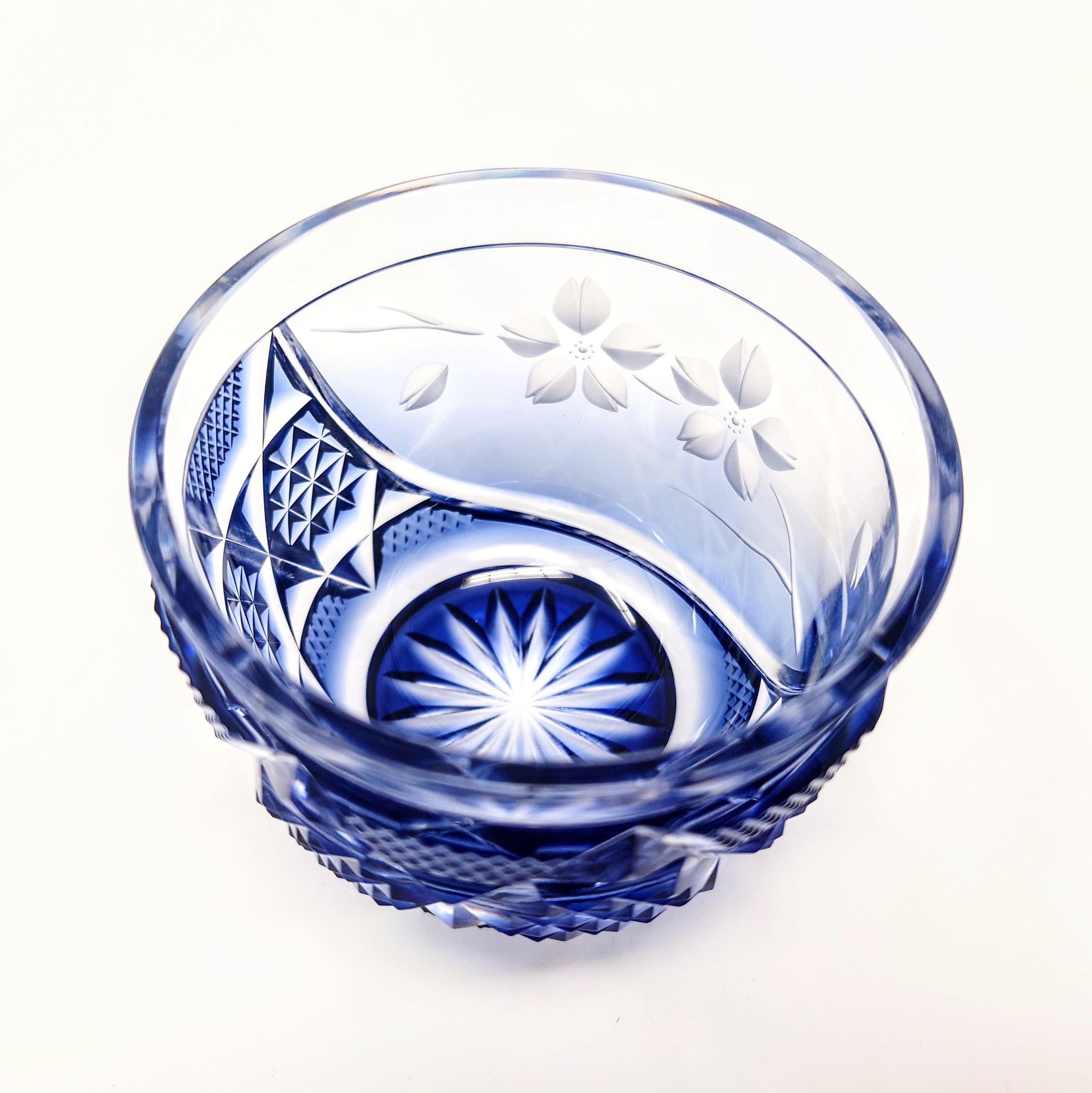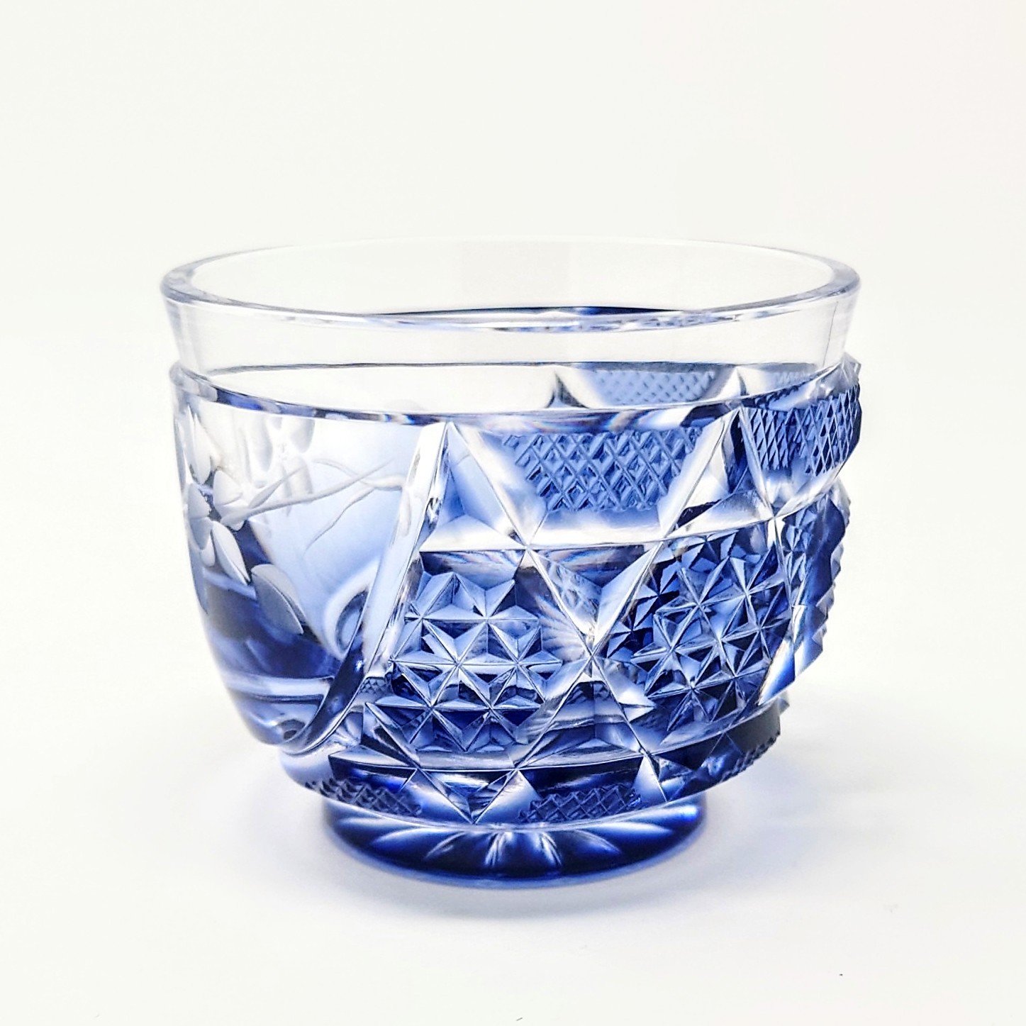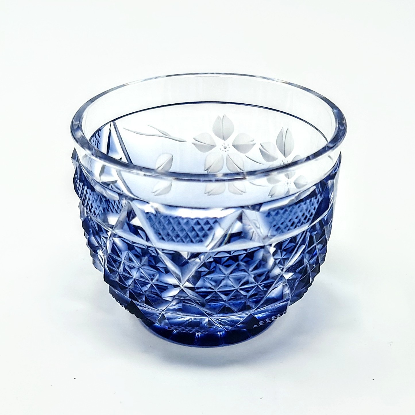 ガラスアーティスト 頌峰(しょうほう)によるこの作品は、贅沢な桜の花が咲き誇る「花やか」︰藍の薩摩切子です。透明と、深みのある青色とのグラデーションが施された、華やかな逸品です。